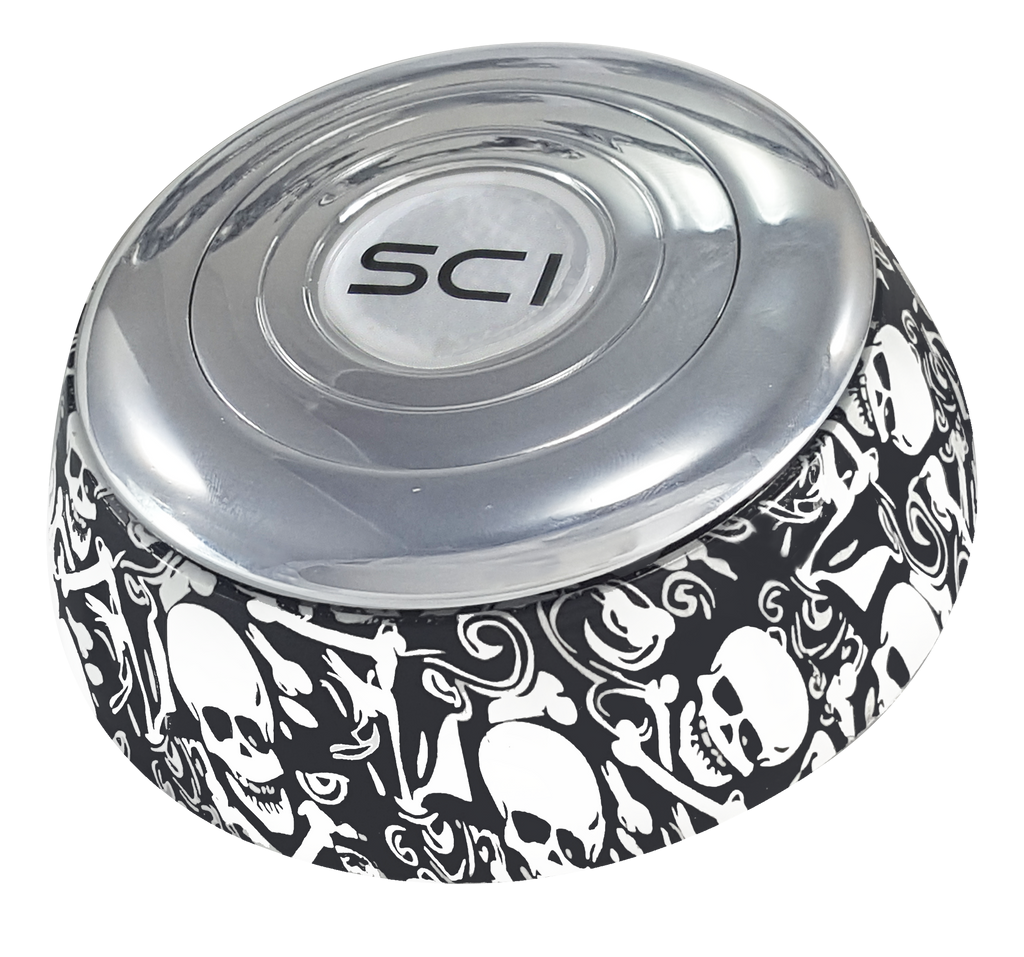 Skulls White - 18" Printed Wood Rim, Chrome 4-Spoke w/ Slot Cut Outs, Matching Bezel, Chrome Horn Button