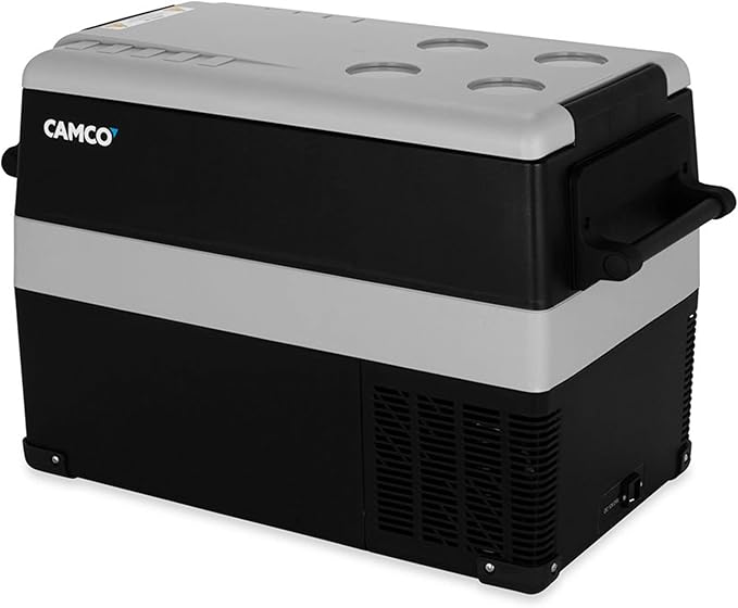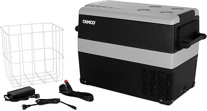 Camco's Portable Refrigerator keeps your food and drinks cold while on-the-go. It is ideal for road trips, RVing, camping, boating and tailgating. Electric powered, the cooler plugs into standard 120V AC outlets and 12V DC vehicle outlets for superior, regulated cooling. It features dual internal compartments with single zone cooling. The temperature can be adjusted between -4° F to 68° F and has two cooling modes: ECO and MAX. A LED control panel provides a digital display that is easy to read and adjust. For nighttime use, interior LED lights allow you to see your cooler contents in limited lighting. The cooler is smart phone compatible, providing remote access via the mobile app. Bluetooth capabilities allow easy connectivity. This durable polymer cooler has reinforced exterior corners and carry handles for easy portability. It has a 45-liter storage capacity that accommodates up to (48) cans. A removable wire basket provides maximum storage space for food and beverages. A 3-mode low voltage protection feature for 12V DC outlets helps prevent dead car batteries or enable a deep draw on dual batteries. Product includes (1) 7-foot A/C adapter and (1) 11-foot 12/24V cigarette lighter plug adapter. Measures 27 3/16-inches (W) x 13 5/8-inches (D) x 18 3/16-inches (H) and weighs 30 lb.