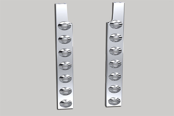 These air cleaner lite bars are designed for Peterbilt 589. Add protection and an unbeatable shine to the rear of the air cleaners. Sold in pairs, each of the air cleaner lite bars have (7) red clear M3 LED lights. Hardware, mounting brackets, lights and harnesses included. Two piece light panels. 304 Grade Premium Stainless Steel.